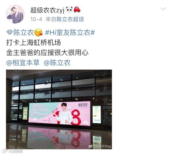 在网上,更有“浓糖”晒出虹桥机场里的“偶遇爱豆应援海报图”,并表示:金主爸爸应援很大很用心!原来这位金主爸爸-相宜本草,不仅包了当晚时间段的环球港大屏,还大手笔包下了2周的虹桥机场大幅海报的应援。