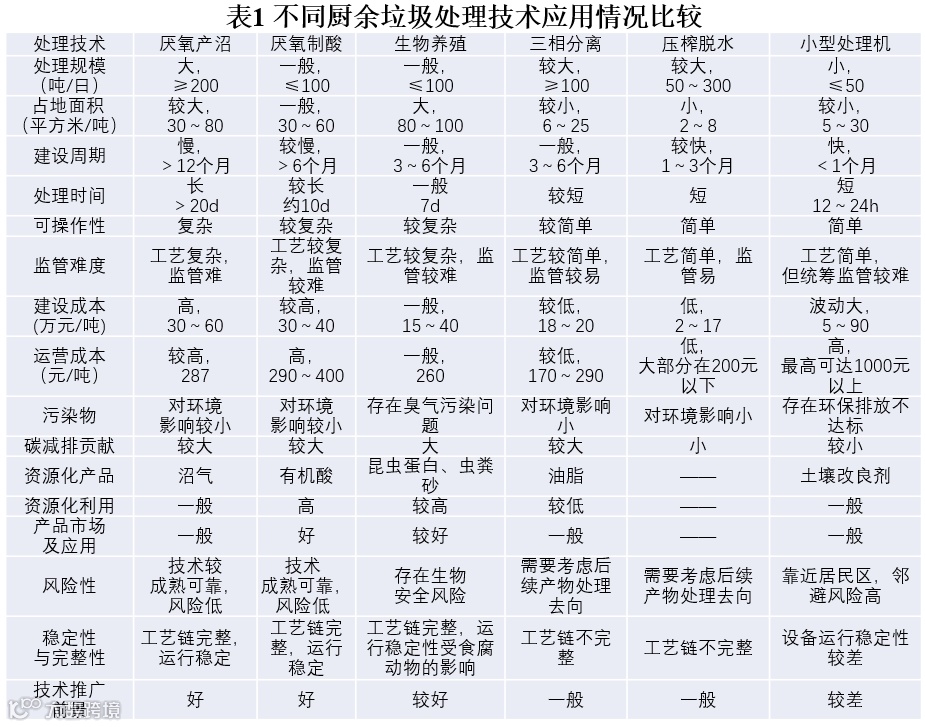 各类技术都有其优缺点和适用场景,从技术应用方面看,厌氧产沼技术相对成熟可靠,自动化程度高、有机负荷承担能力高,一般应用于大型处理项目,但该技术工艺复杂,处理周期长,处理后会产生大量的沼渣沼液需要进一步处理。相比厌氧产沼,厌氧制酸由于不发生产甲烷阶段,因而处理周期大幅度缩短。生物养殖技术通过生物质形态的完全转化,完全阻断同源性蛋白病毒在食物链中的传播,技术相对可靠,但在分选进料、臭气控制、稳定存储方面仍具有较大挑战,一般处理规模在100吨/日以下。压榨脱水及三相分离通常适合作为预处理技术与其他处理工艺组合协同应用,不仅能通过分类分级处理减少后端设施的处理压力,同时还能降低杂质和油脂等物料对末端设施运行造成的损耗,减量化优势明显,资源化利用水平不高,但若将其单独作为处理设施应用时,需考虑其处理后各类产物的去向。小型处理机技术具有工艺简单、占地小、建设快及处理周期较短,基本能实现日产日处理等优势,但一般以几吨或十几吨的设备为主,且由于市场上设备类型多、更新快,运行稳定性还有待提高。