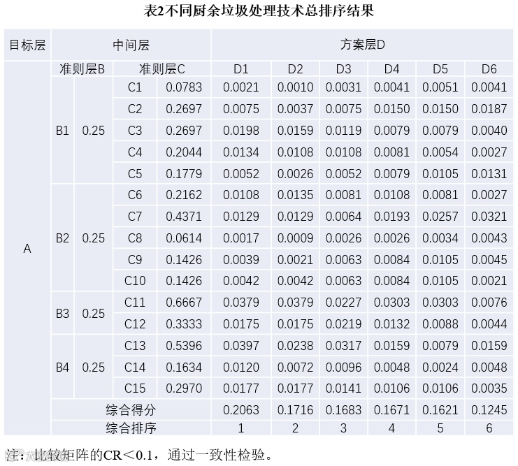 三是对于形成的判断矩阵,计算其最大特征值及其相应的特征向量,经过对特征向量的数学处理,进一步得出各指标因素的权重。在计算得到某一层次相对于其上紧邻层次各个因素的单排序权重后,用上一层次因素本身的权重进行加权综合,得到层次总排序的权重值。最终根据判断矩阵标度,对厨余垃圾处理技术指标体系中各指标进行归一化值的计算,最终得到各技术选择的得分。