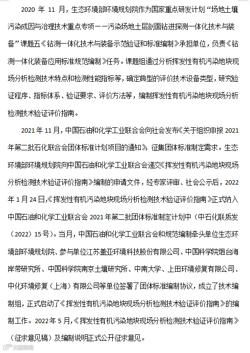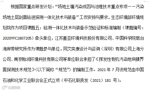 盖亚科技参与起草的《挥发性有机污染地块膜界面探测技术规范》等两项团体标准是由国家生态环境部环境规划院牵头编制,经过多轮专家咨询和会议评审,多方征求意见和反复修改完善,由中国石油和化学工业联合会标准化工作委员会正式发布、实施。有效指导操作者使用统一的方法和标准利用一体化钻测设备在全国各地开展污染地块调查评估,在VOCs污染地块调查领域填补一块国家空白,为我国污染地块调查技术和装备提升提供技术支撑。