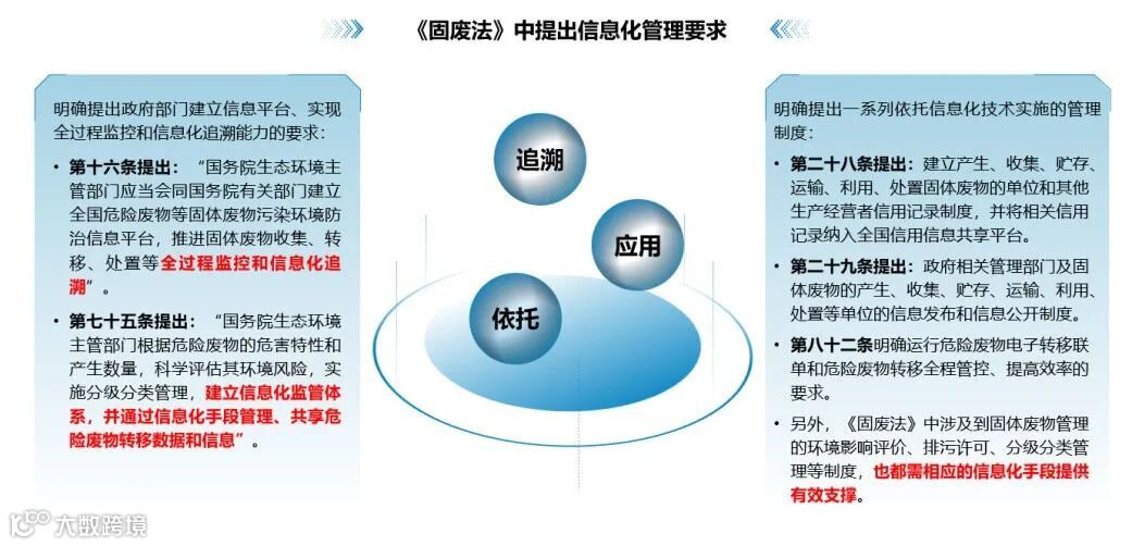 目前,监管领域固废处置信息化尚处于1.0发展阶段,还未实现大面积推广升级换代。新《固废法》对固废处置信息化提出了明确的管理要求,包括政府部门应该建立信息平台,实现全过程监控和信息化追溯,也明确提出了一系列依托信息化技术实施的管理制度,以推进信息化的追溯能力,拓宽信息化的应用范围。