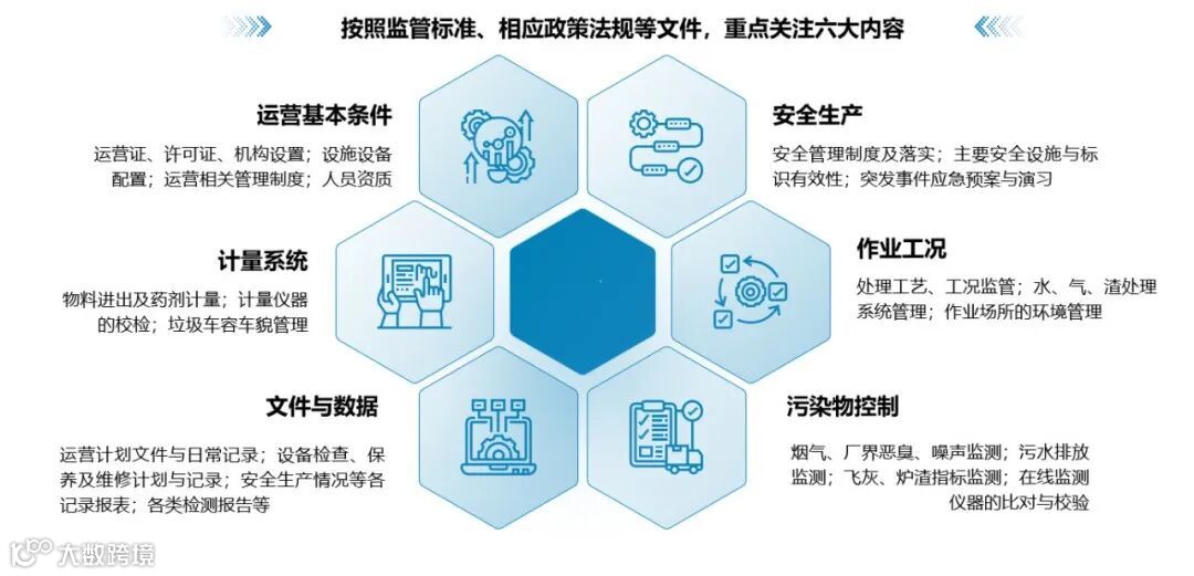 按照监管标准CJJ/T 212-2015、CJJ/T 213-2016以及相应的政策文件,监管内容重点包括运营基本条件、计量系统、文件数据、安全生产、作业工况和污染物控制六大方面,充分涵盖了政府主管部门的管理需求和技术支持内容。其中,计量数据是主管部门的管理重点,涉及垃圾处理服务费等财政资金使用,以上海为例,其所有计量体系为一套独立的第三方监管系统。