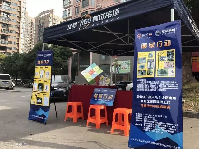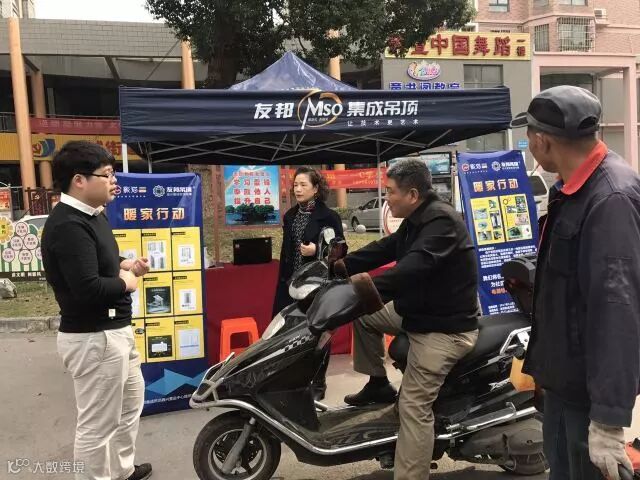 大帐篷支开,展架挂起来,一看是大品牌友邦吊顶联合做的活动,又是免费上门检测、维修以及以旧换新的福利活动,居民纷纷都围了过来。