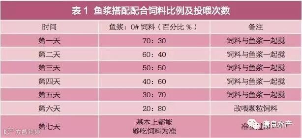 鱼苗长至3厘米以 上时可以开始训化投喂鱼浆。刚开始投喂水蚤和鱼浆的混合饵料,投喂过程中慢慢减少水蚤的量,直到完全投喂鱼浆,7-10天可全部转食鱼浆;转食鱼浆成功后,再在鱼浆中加入小颗粒配合饲料, 以后逐渐减少鱼浆的量,7-10天可全部转食配合饲料。