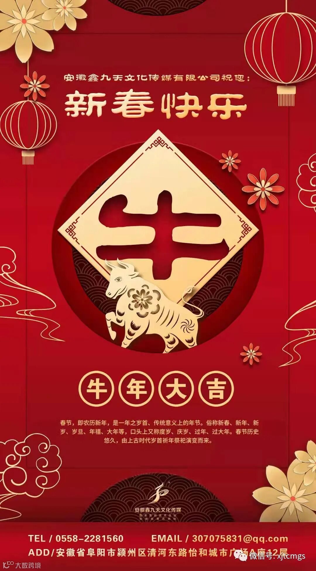 新的一年,安徽鑫九天文化传媒有限公司全体员工,祝你新年快乐,洋洋得意;晦气扬长而去,好运扬眉吐气;阳春白雪漂亮,洋洋洒洒纳福;万事阳关大道!