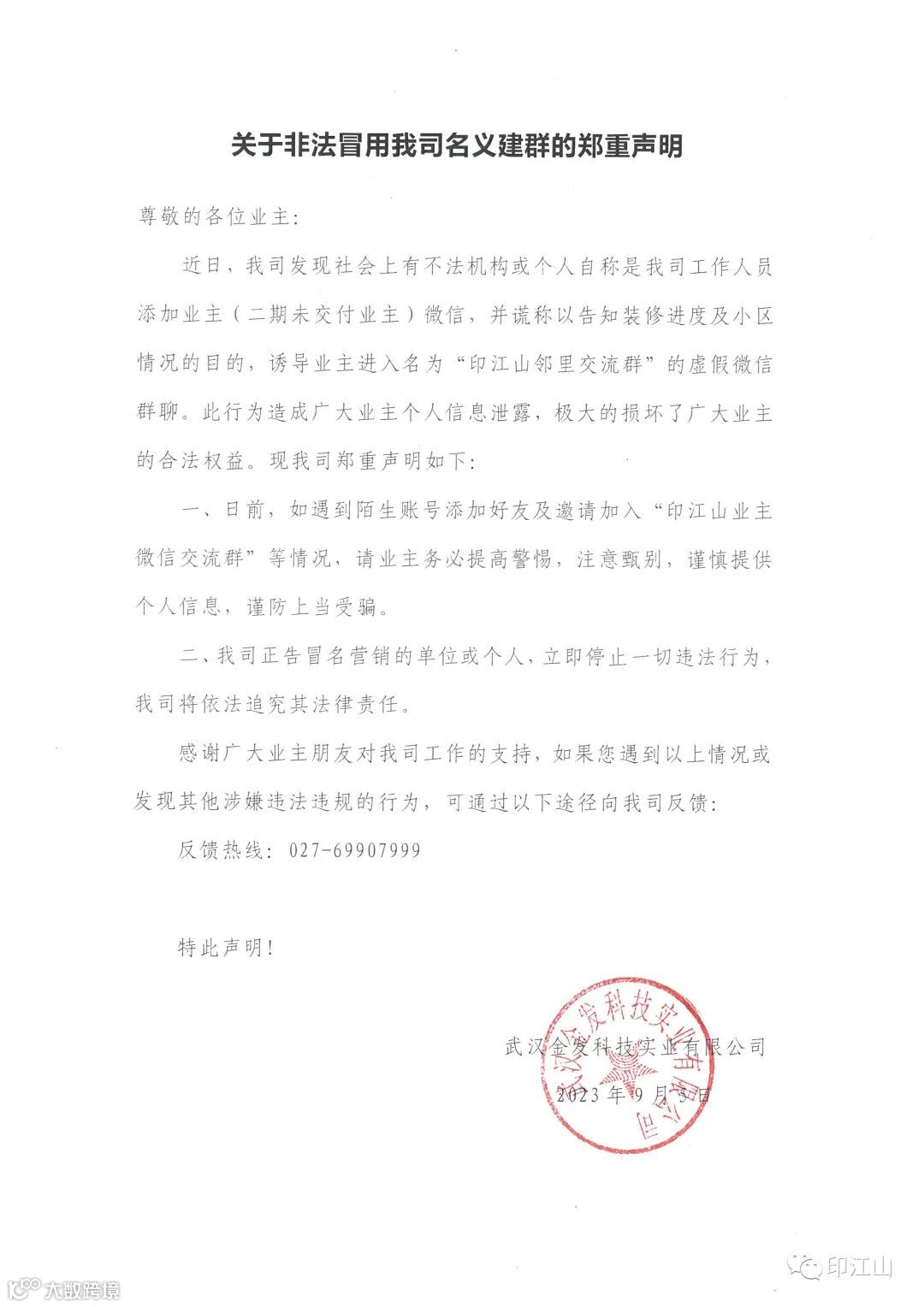 近日,我司发现社会上有不法机构或个人自称是我司工作人员添加业主(二期未交付业主)微信,并谎称以告知装修进度及小区情况的目的,诱导业主进入名为“印江山邻里交流群”的虚假微信群聊。此行为造成广大业主个人信息泄露,极大的损坏了广大业主的合法权益。现我司郑重声明如下: