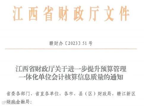 在《江西省财政厅关于进一步做好预算管理一体化单位会计核算工作通知》(赣财办[2021]16号)、《江西省财政厅关于单位资金实行集中支付的通知》(赣财库[2022]28号)等文件基础上,为进一步提升预算管理一体化单位会计核算信息质量,江西省财政厅发布《关于进一步提升预算管理一体化单位会计核算信息质量的通知》(赣财办[2023]51号),对相关业务规范和技术标准进行了更新和说明。