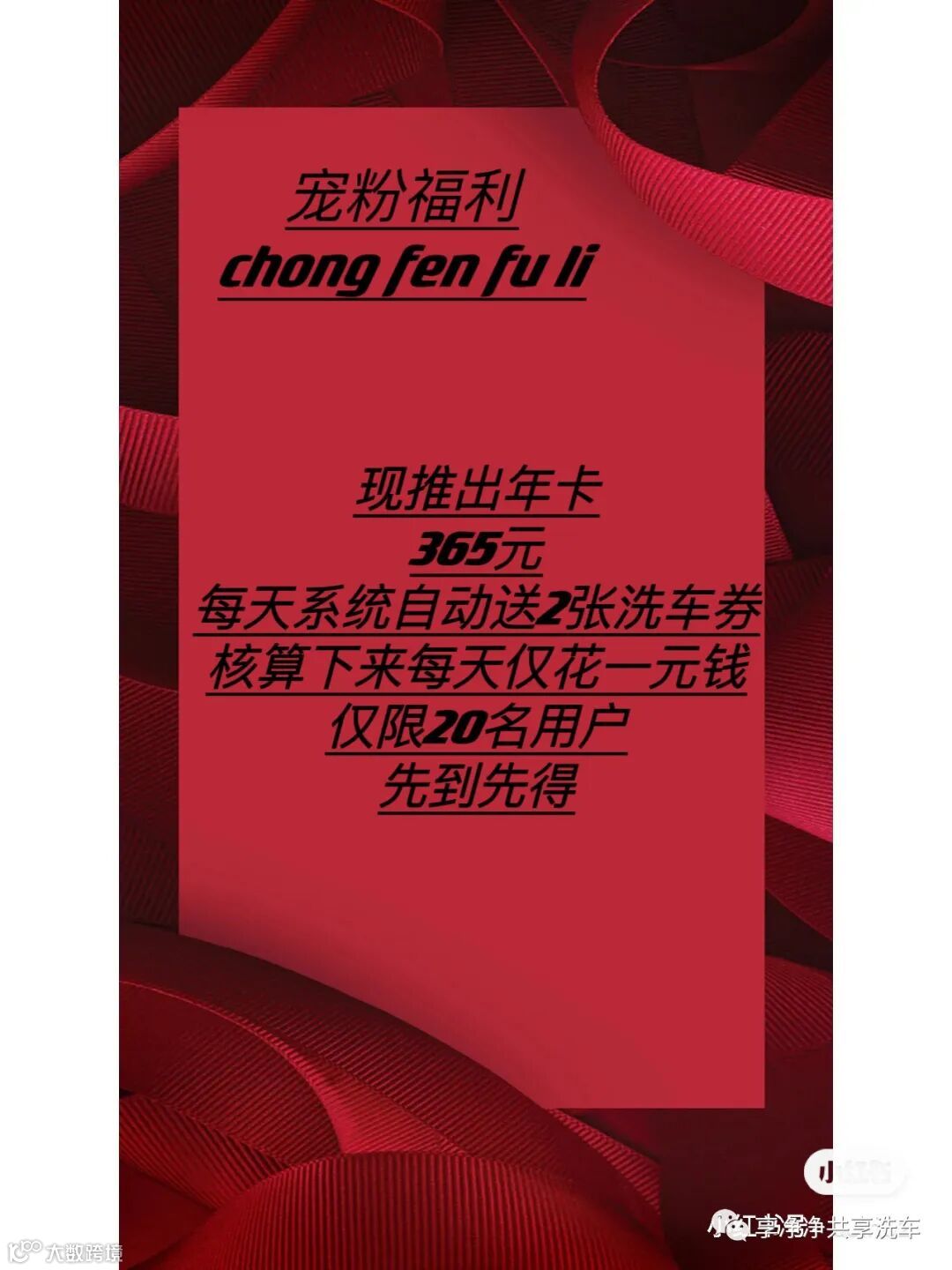 享净净共享洗车山西享净净环保有限公司在今年以成立了5年,一路走到现在,我们不断努力升级,不断完善,只为让用户更加方便和实惠,用户的建议和反馈我们都有认真的完善和改变,现公司准备了20名年卡充值会员,回馈给新老用户 。感谢用户的一路陪伴,感恩一路同行。