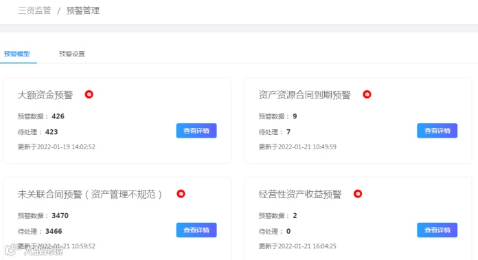 预警和监管是“三资”管理的重中之重,平台设置了预警监督功能,如在资金预警方面,设置大额资金、现金支出超限、村集体支出资金受益、村级财务支出报销等预警项;在合同预警方面,设置合同金额过低、资产资源合同到期、合同签订年限超过指定阈值、收款与计划不符等预警项...