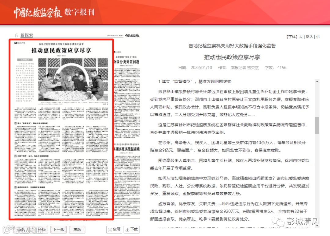 1月10日,《中国纪检监察报》刊发《推动惠民政策应享尽享》一文,文章采用徐州市用好大数据手段强化监督困难群体社会救助福利政策落实情况专题监督相关工作经验,全文如下: