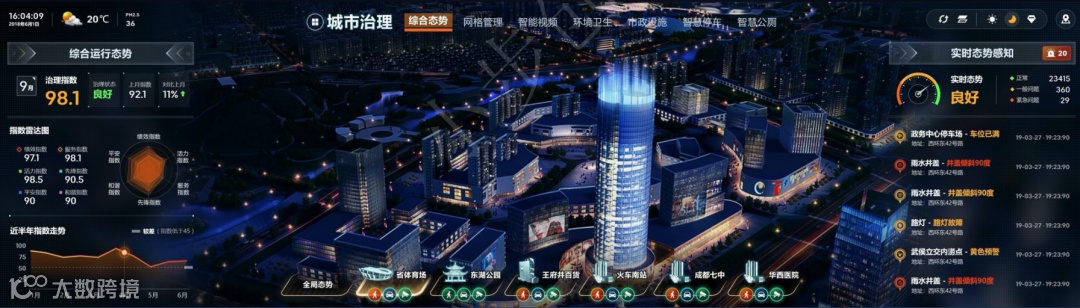 综合运用3D可视化、CIM城市信息模型、语义化建模、实时渲染引擎等技术,将物理城市映射为三维数字化底座,同步叠加城市运行的各类数据,实时展示城市真实运行状态,将传统静态的数字城市升级为可感知、动态在线、虚实交互的数字孪生城市。
