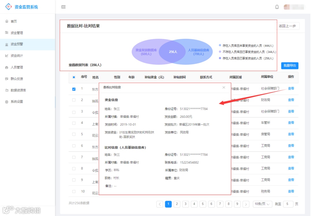 纪委部门工作人员可手动选择资金发放数据,并查看任一资金项目、任一批次的数据预警比对结果。