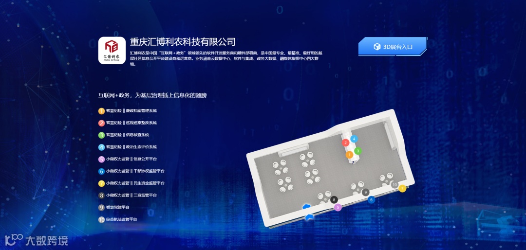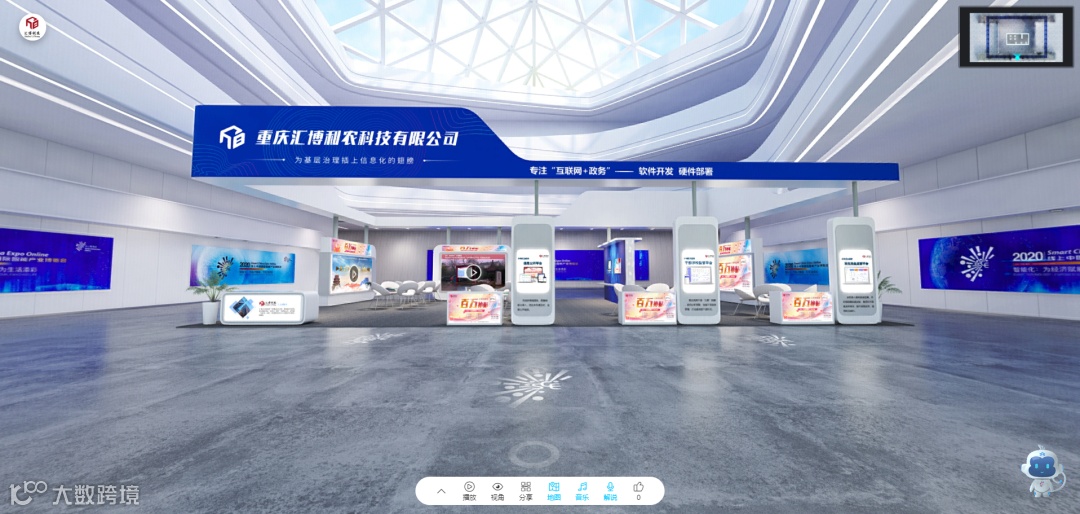 本次2020线上智博会“线上展厅”借助3D虚拟建模技术,设置线上重庆、智能产品、智能制造、智能应用、智能技术和区域合作6个虚拟展区。重庆汇博利农科技有限公司携“百万补贴”亮相智能应用展区。