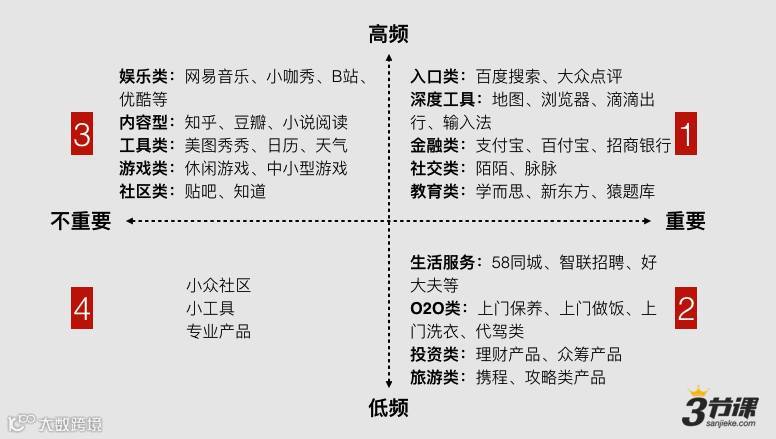 哪些服务是可以接入,哪些又是不可以接入的呢?我先看一个模型。按照重要/不重要,高频/低频,我们将互联网产品分别放入四个象限。