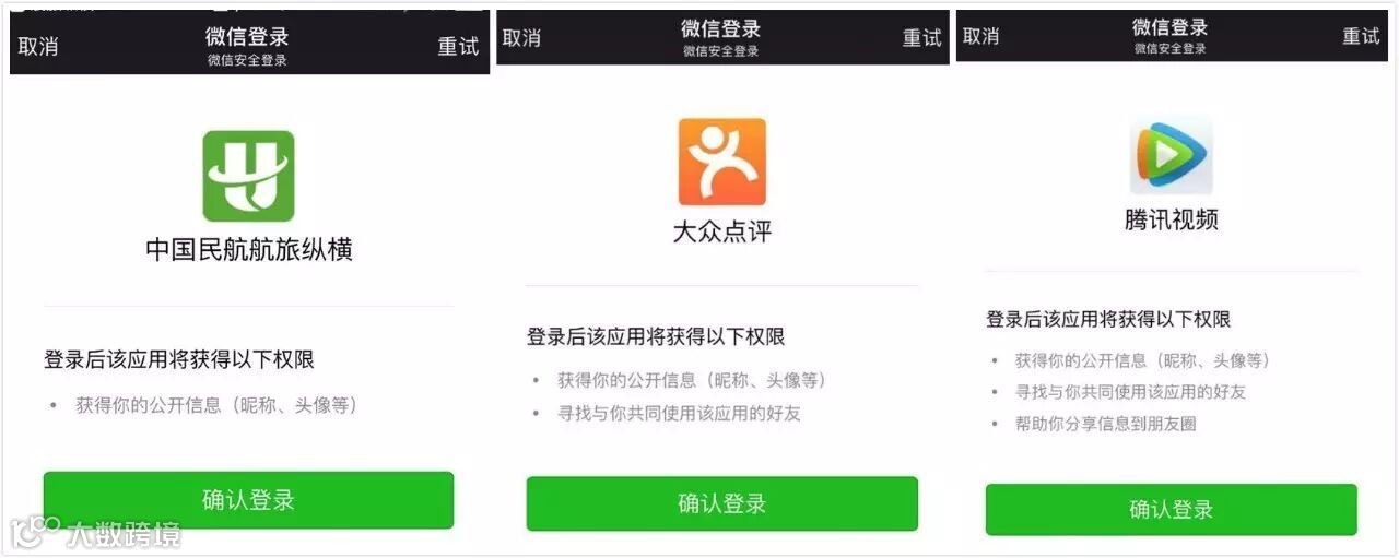 只开放公开信息:昵称、头像,其实也就是登陆ID,所有的开发者都可以接入,比如航旅纵横。