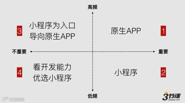 然后,我们分别看这4个象限的拥抱策略,应该说,如果你的服务是很高频的,而且对于交互和界面体验的要求很高的话,还是要用原生(Native)来做。但如果你是低频/中频且重要的服务的话,你应该毫不犹豫地加入微信小程序的申请队伍。