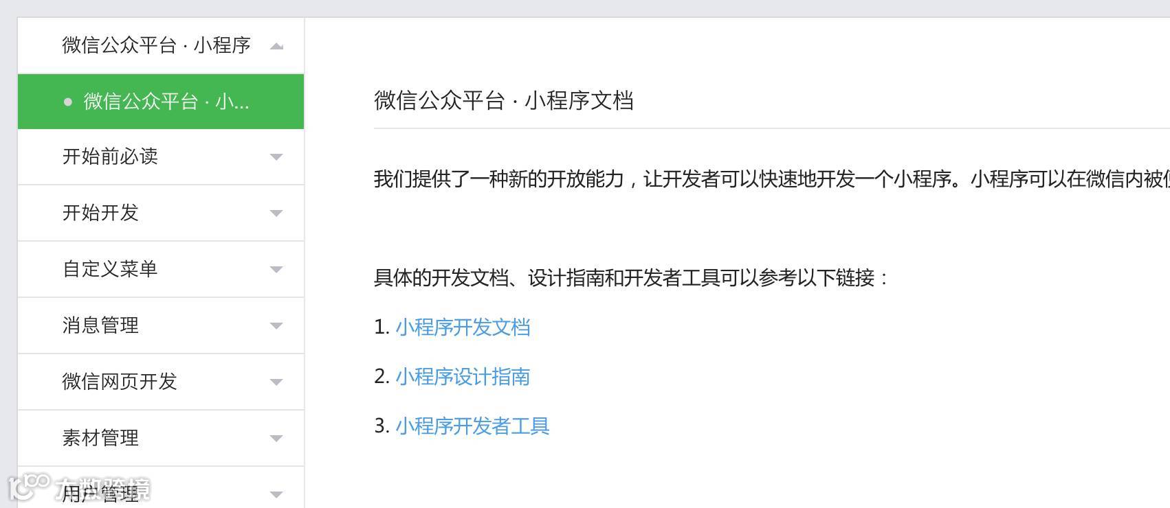 该页面内容精简,结构独立,几个链接进去后发现“小程序”和“公众号”文档的界面及操作风格迥异。