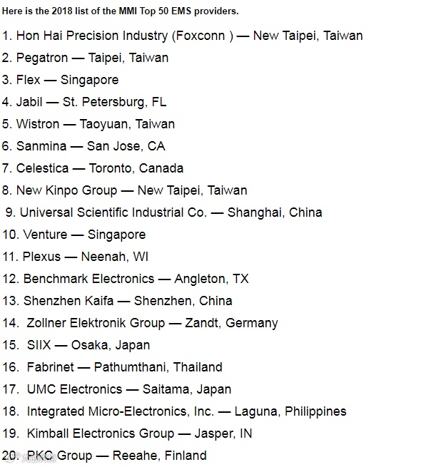 日前,专业调研机构MMI发布了最新的全球EMS代工厂50强2018年榜单:
