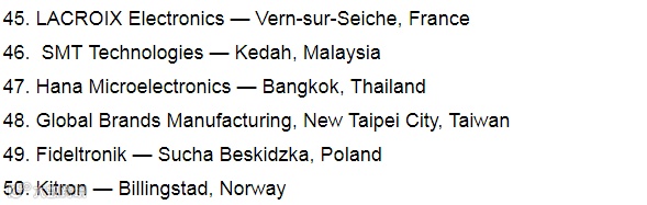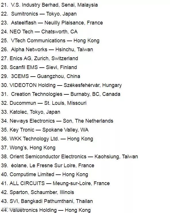 这份新榜单和去年的榜单相比,前8名几乎变化不大,第9和第10却给大家带来了惊喜,分别是总部位于上海(台湾投资)的环旭电子和新加坡的万特集团,把去年的两家美国企业贝莱胜及佰电挤下了前10名。