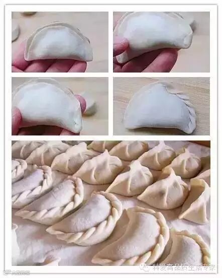 7、花边饺子。饺子皮对折捏合后,从一边角起,向内折压;之后沿着第一个折痕,依次向内锁边,就可以看到花边的样子啦。