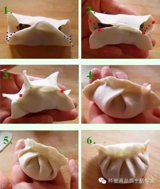 3、褶子饺子。依照图中标出的红点捏上,变成图3四个耳朵。然后都往中间捏,就是图5的4个耳朵的饺子啦,图6是6个耳朵的。