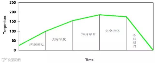 按照回流焊中温度、时间的变化,焊接位置的锡膏会依次经历以下过程。