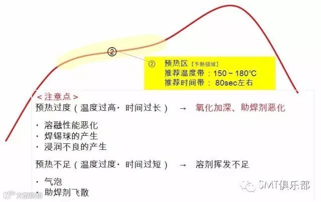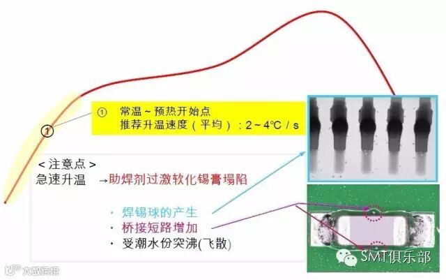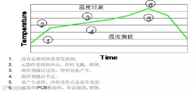 初始的升温阶段需要注意升温速率不可快。因为升温过快可能导致PCB或零件因热应力损坏,还可能使稀释剂急速的挥发造成四溅。升温速率的限制一般是零件制造商所建议,设定在4℃/sec以下,介于1~3℃/sec之间。