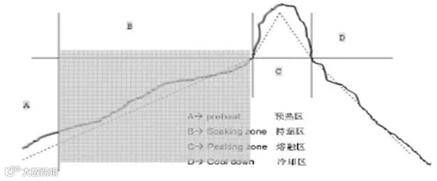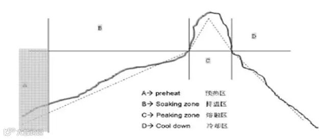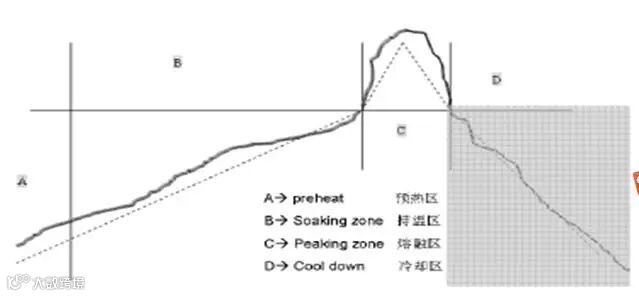 按照温度-时间的变化规律,并结合焊料的变化阶段,可以将炉温曲线分解为:预热区、保温区、熔融区、冷却区
