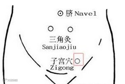 穴位位置:子宫穴位于下腹部,脐下一横掌处(脐下4寸)正中。左右旁开四横指(旁开正中线3寸)的距离各有一点即是此穴。