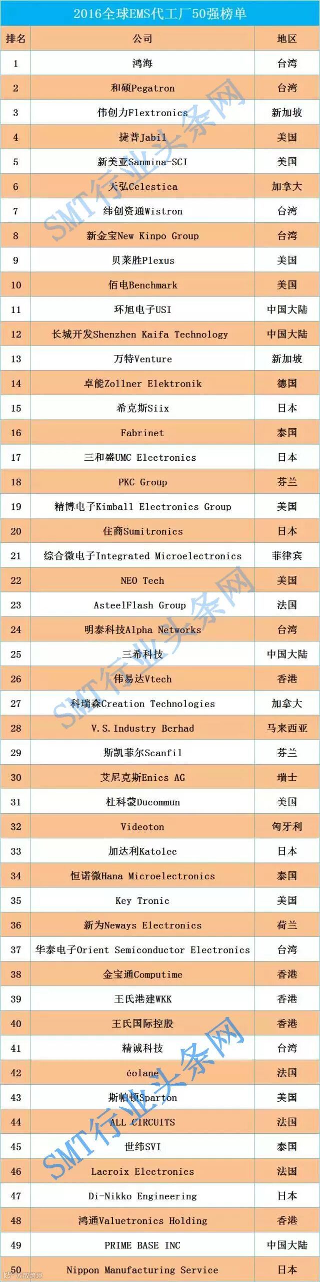2017最新全球知名电子制造服务EMS代工厂50强排行榜隆重诞生!