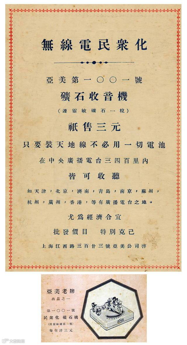 民国12年(1923年)1月23日,美国人奥斯邦氏与华人曾君创办中国无线电公司,通过自建的无线电台首次在上海播送广播节目,同时出售收音机。全市有500多台收音机接收该电台广播节目,这是上海地区出现的最早一批收音机。之后,随着广播电台不断的建立,收音机在上海地区逐渐兴起,均为舶来品,以美国出品最多,其种类一是矿石收音机,二是电子管收音机,市民多喜用矿石收音机。