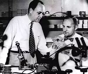 20世纪50年代,德州仪器的Gordon Teal(左)还在贝尔实验室工作。另一位是著名物理化学家Morgan Sparks。他们成功合作从锗晶体中研制出了世界上第一个可使用的结式晶体管。