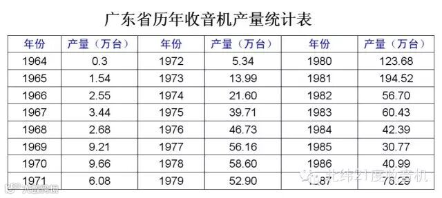 1979年,佛山无线电一厂用来料加工赚取的工缴费引进国外收音机生产线,使广东的国产收音机质量和产量有很大的提高。1979年,全省收音机产量达到52.9万台。1981年,全省收音机产量达到194.52万台,电子管收音机已被晶体管式和集成电路式收音机所取代。1982年,由于收录机发展迅速,收音机产量降为56.7万台,1985年又下降为30.77万台。