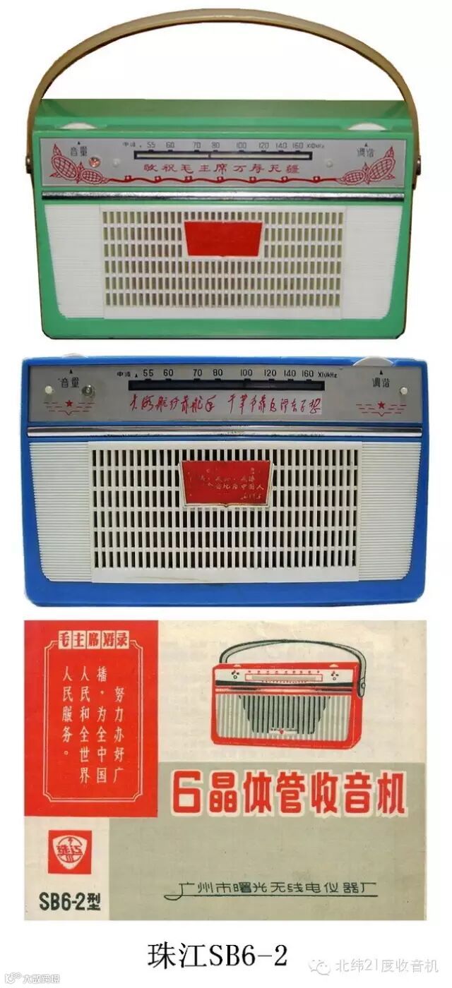 70年代以后,晶体管便携式收音机花色品种逐渐增多。为进一步满足顾客旅游和欣赏音乐的需要,新产品开发逐渐向一大一小方向发展。最具代表性的是70年代初广州曙光无线电厂研制成功的珠江牌SB6-8型袖珍式收音机,其外形小,灵敏度高,音质好,是国内市场的畅销品,也是广州曙光无线电厂首次推向国际市场的产品,曾大量出口东南亚等第三世界国家,1974~1987年累计生产142.80万多台。大台式较有代表性的是70年代后期开发的珠江牌SB12-1型三波段晶体管收音机,其最大输出(有效值)达到12瓦,曾在第四次全国收音机评比中获得最佳音质奖。