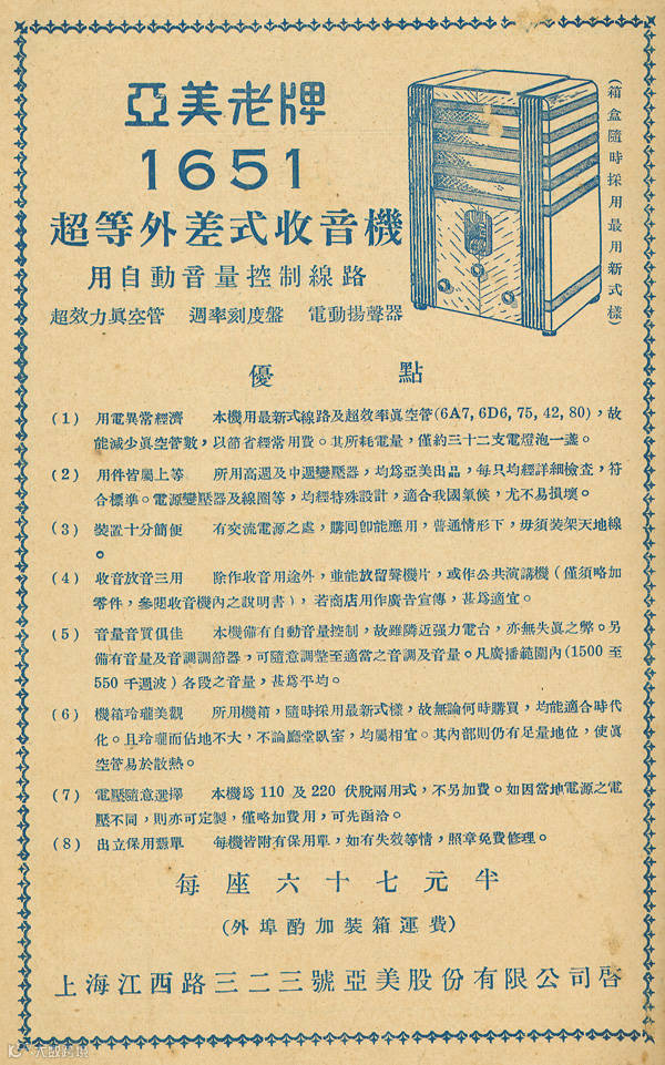 如果将民国时期的收音机状况作一简单分期,大致可以划分为三个时期:1923年至1934年为一期,洋货一统天下。1935年至1945年为二期,以亚美公司1651型五灯收音机问世为标志,国产收音机开始参与国内收音机市场的竞争。1946年至1949年为三期,进口的美国收音机以及引进美国生产线组装的美国收音机,成为收音机市场的主流。