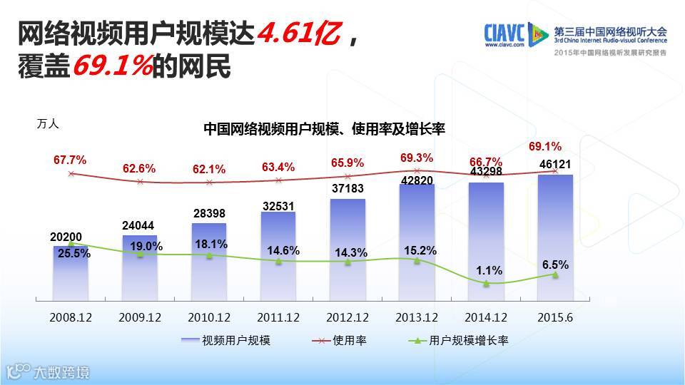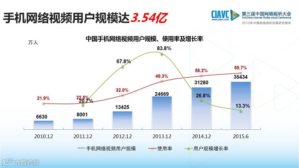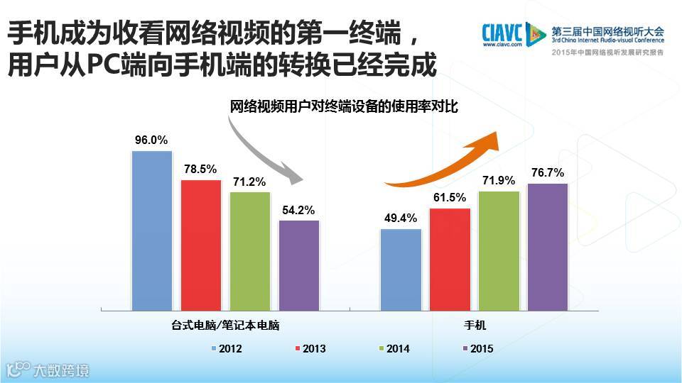 【导读】12月2日,中国网络视听节目服务协会在第三届中国网络视听大会上发布了《2015年中国网络视听发展研究报告》。《报告》指出:手机视频用户规模在过去的三年内上升27.3个百分点,达到3.54亿,76.7%的视频用户选择用手机看网络视频,手机已经成为网络视频的第一终端。