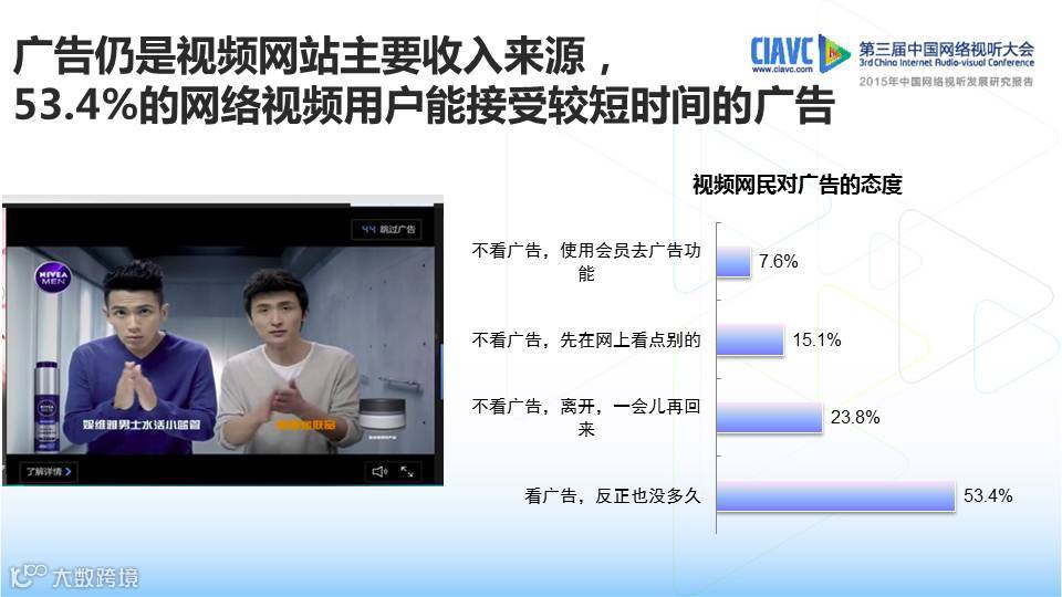 8.53.4%的网络用户能接受较短时间的广告,广告仍是视频网站主要收入来源