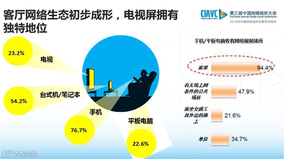 随着智能电视、互联网盒子等设备的普及,电视终端也成为客厅生态中收看网络视频节目的重要设备,使用率达23.2%。家庭作为人们娱乐休闲的主要场所,是通过移动设备收看网络视频节目的最主要场所,94.4%的移动视频用户在家庭通过移动设备收看网络视频节目。专家指出,如果电视这一大屏的用户体验足够好,在家看视频的用户有可能向电视端转化,电视屏存在较大的发展空间。