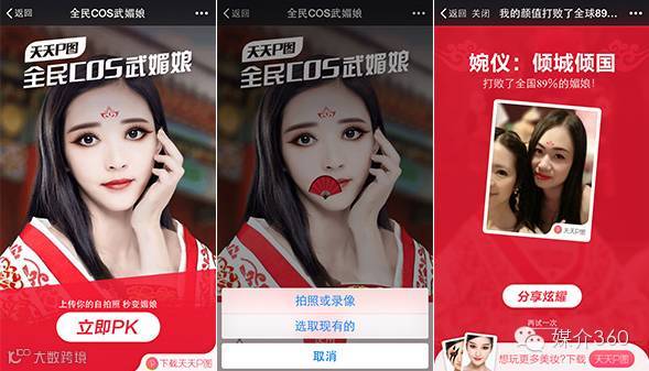 天天P图抓住武则天热播的契机推出了风靡海内外的媚娘妆,同时《全民COS武媚娘》的H5互动页也第一时间上线,操作简单易上手,一键上传照片就能立刻完成媚娘妆,与万千媚娘们进行PK,娱乐了大众又推广了产品。