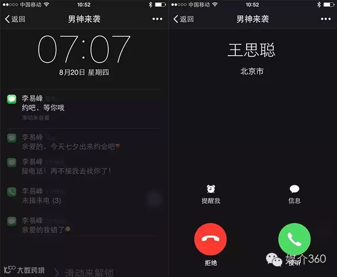 整个互动通过李易峰的信息,以一个苹果手机锁屏画面开始,需要用户滑动解锁,之后就是一个短信,直接动画做好,提醒用户点击发送,之后就到下一个环节,一堆男神出现之后,就要上广告了。广告来了之后,一个电话响起,是“王思聪”来电,这个应用不论你是点击拒绝还是接通,王思聪的电话都会通的,人家是开着兰博基尼来接你的。