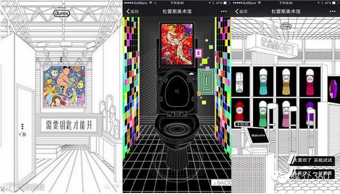杜蕾斯的第一座美术馆的首个展览叫作“液体主义群展”,邀请了 12 位画师创作以“液体”为主题的画作,并置于线上画廊中。除了画作,“画廊”里还设计了一些互动性的彩蛋,比如美术馆里一扇上锁的门,需要找到厕所里的钥匙才能打开,点击某处细节能获得杜蕾斯微信商城的优惠券。浏览至尾,会链接到杜蕾斯在京东商城的“杜蕾斯情趣啫喱特卖会”。