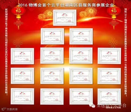 湖南省15家区县参展服务商企业将作为2016年物博会首个云平台湖南省区县参展服务商企业,享有物博会3号展馆的独有荣誉及独有服务。名单为:长沙云领电子商务有限公司(长沙市长沙县)、宁乡梓盟电子商务有限公司(长沙市宁乡县)、湖南九九鸿云网络科技有限公司(长沙市开福区)、长沙见旺云电子科技有限公司(长沙市雨花区)、长沙市望城区佛云网络科技有限公司(长沙市望城区)、长沙市芙蓉区荣云网络科技有限公司(长沙市芙蓉区)、汨罗市天惠电子商务有限公司(岳阳市汨罗市)、岳阳理想文化传播有限公司(岳阳市岳阳楼区)、湖南鼎云网络科技有限公司(岳阳市平江县)、衡阳鑫慷云中云电子商务有限公司(衡阳市衡阳县)、茶陵筋斗云网络科技有限公司(株洲市茶陵县)、株洲云瑞电子商务有限公司(株洲市荷塘区)、攸县凤云电子商务有限公司(株洲市攸县)、澧县云枡网络科技有限公司(常德市澧县)、常德祥云电子商务科技有限公司(常德武陵区)。