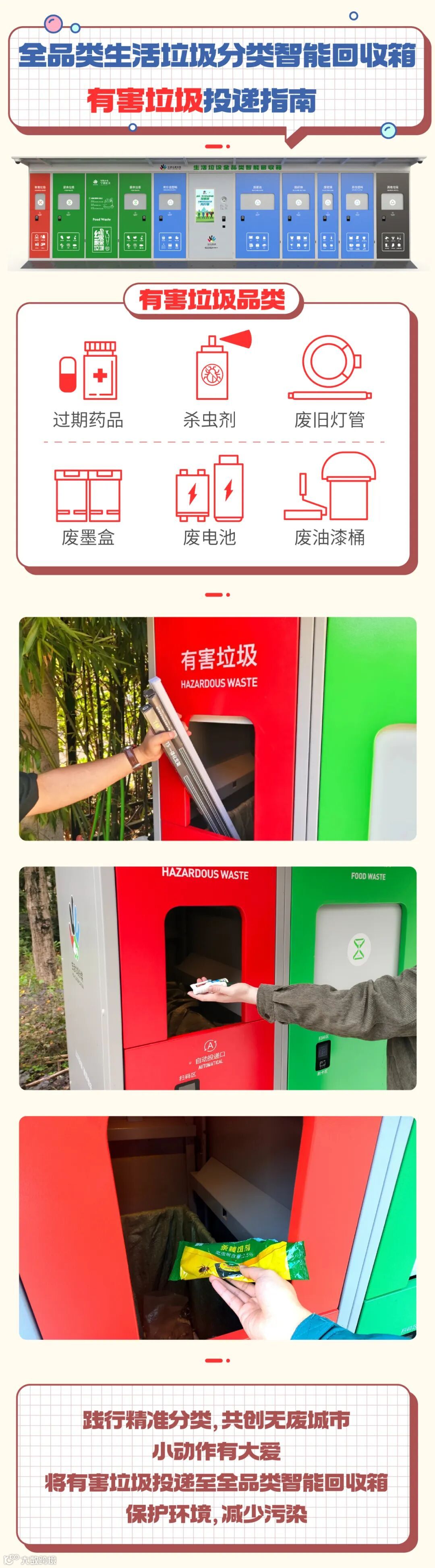 每月21日是宁波有害垃圾收集宣传日。全品类智能回收箱设置了“有害垃圾”回收仓,家里过期的药品、充电电池、杀虫剂空瓶,办公室的废旧墨盒等都可以投递至其中,全天候、一站式,随时都能做好垃圾分类。