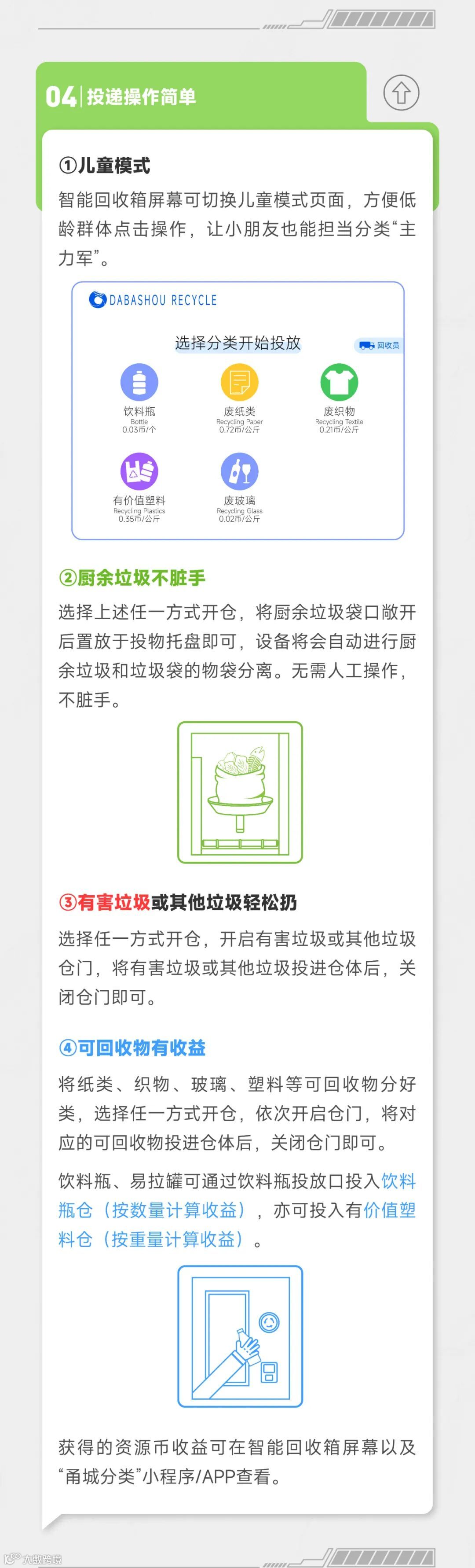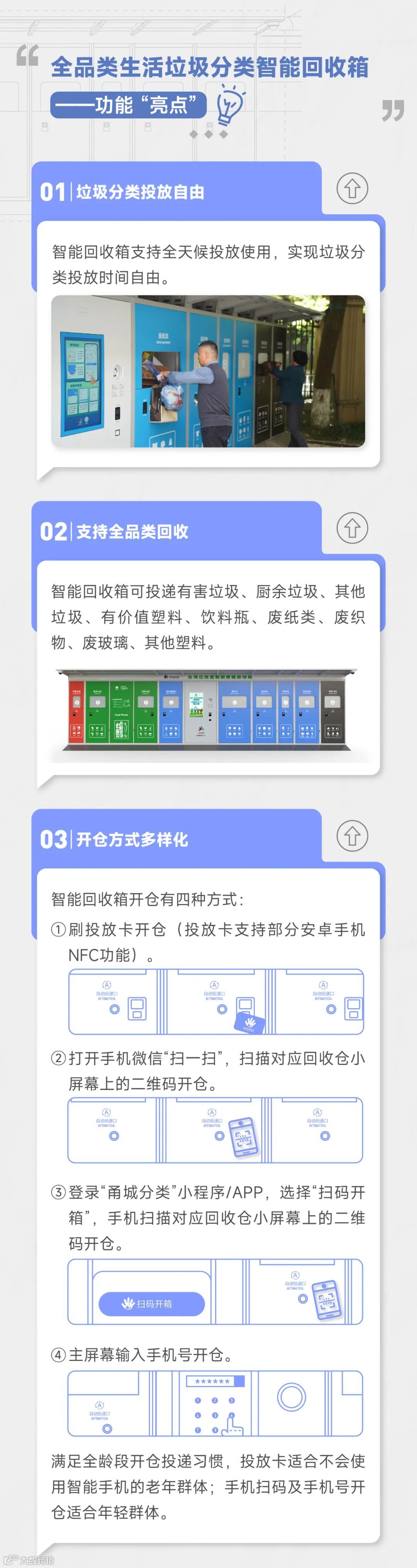目前,智能回收箱已在全市范围铺设了200多个点位,未来将实现全市4000个网点的铺设目标。垃圾分类,全民参与,使用智能回收箱将成为阿拉宁波人的日常。全天候“站岗”、一站式投递不脏手、全龄段友好......快来一起看看这款智能回收箱功能“亮点”吧。
