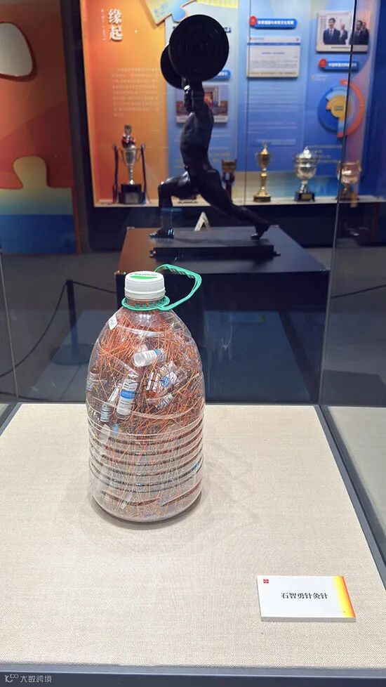 在二层展区,装满五升矿泉水桶的针灸针格外引人关注,这是石智勇受伤期间接受扎电针治疗时使用过的实物。“腰受伤之后让我跌入低谷,如今坚持下来,用冠军结束职业生涯,这桶针见证了我的成功与失败。”石智勇动情回忆,“我记得有一天医生为了帮我治疗,足足扎了一百多针。我希望这桶针能激励更多年轻人,因为它不仅见证了我的永不放弃,也代表着中国举重人永不服输、勇攀高峰的精气神。”