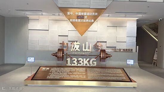 走进博物馆大门,映入眼帘的是以倒立的大“金字塔”呼应“举”这一动作,镌刻着中国举重所破世界纪录的“能量块”,上面清晰记录着中国举重运动员创造的世界纪录即时总数:截至当前共计“1171“次。此外,一尊标注“133kg”的杠铃雕塑同样格外醒目,这是为纪念1956年陈镜开打破的新中国体育史上首个世界纪录。