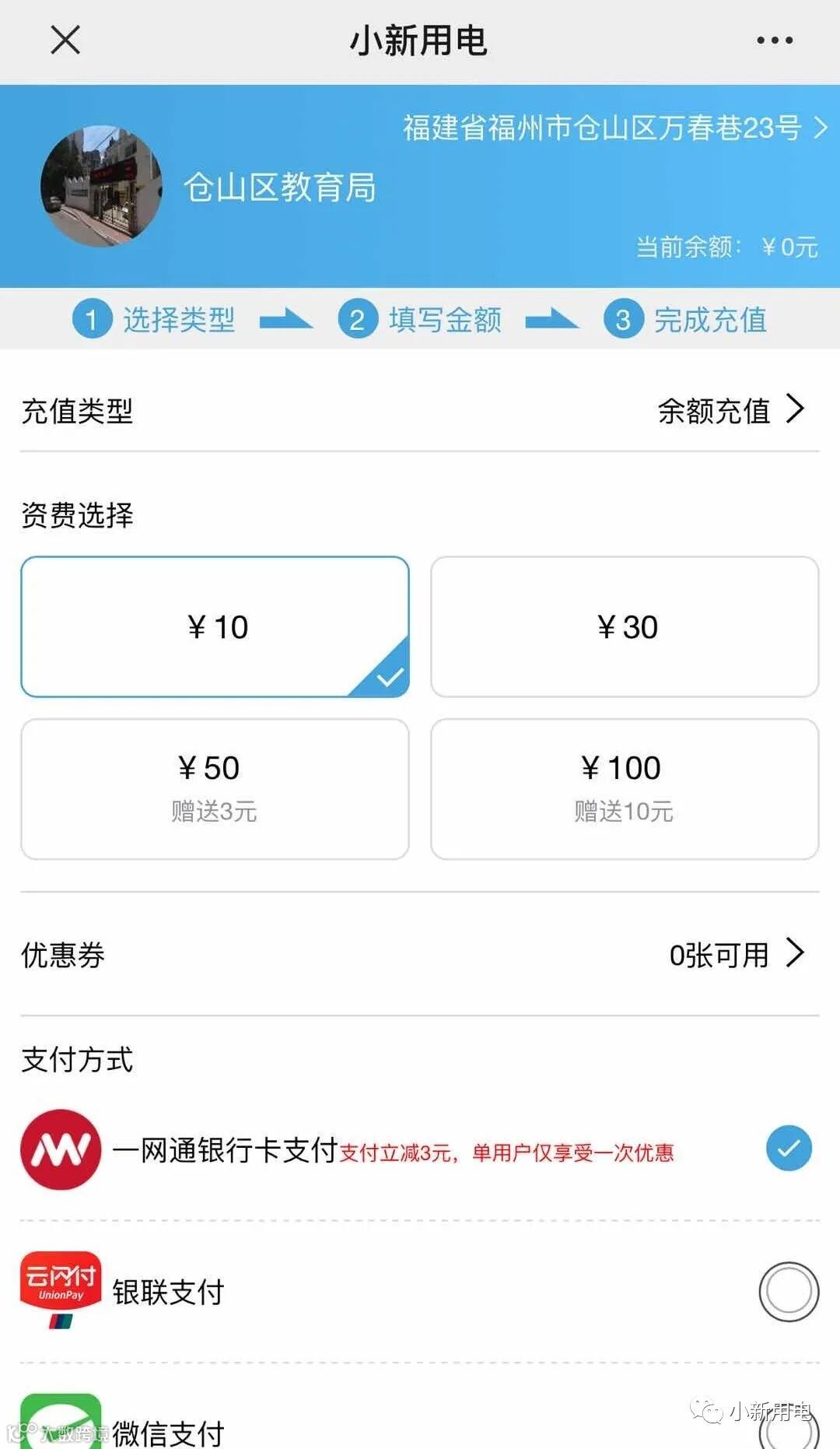第一步:打开微信公众号【小新用电】,选择菜单栏的【优惠充值】。选择充值金额,勾选【一网通银行卡支付】。