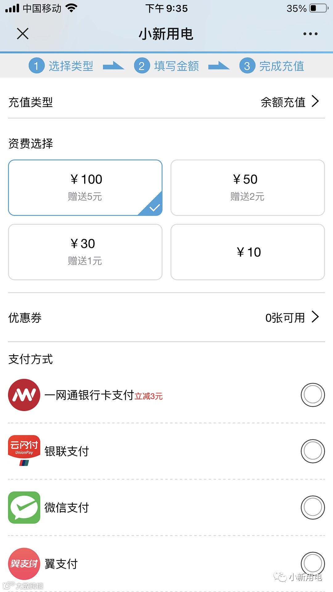 打开微信公众号【小新用电】,选择菜单栏的【优惠充值】。选择充值金额,勾选【一网通银行卡支付】。