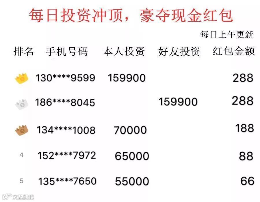 (划重点:本人投资+好友投资金额之和进行排名,所以,邀请的好友越多(尤其是土豪朋友),获得红包的机率就越高)