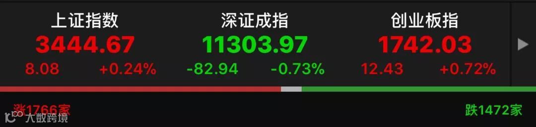 1、【收评:沪指盘中创熔断后新高涨0.24%,金融股集体大涨】午后开盘,市场成交量开始萎缩,创业板高位盘整,沪指则收回涨幅,两市成交量较前一日放量。盘面上看,三大指数逐渐回落。尾盘,沪指震荡回落,深成指继续低位盘整,创指则持续高位震荡,但涨幅有所收窄。截止收盘,沪指报3444.67,涨0.24%;深成指报11303.97,跌0.73%;创指报1742.03,涨0.72%。从盘面上看,券商、保险、银行居板块涨幅榜前列,房地产、白酒、区块链居板块跌幅榜前列。(新浪财经)
